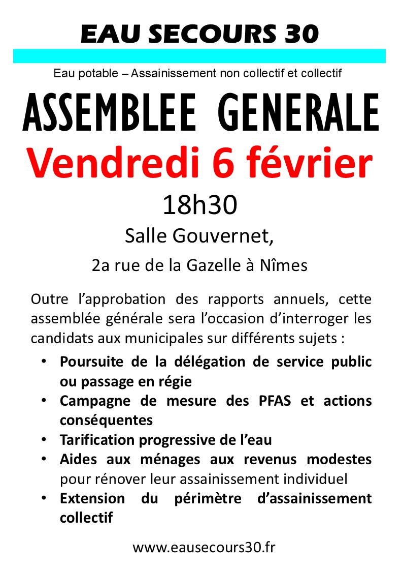 Venez nombreux pour échanger avec les candidats aux municipales ! ________________________________________________________________________________________ Notre lettre H2O N°11 est en ligne. Découvrez-la sans attendre. On y parle du troisième avenant au contrat avec VEOLIA, du déficit persistant du contrat, du choix d'une nouvelle Délégation de Service Public en 2028, ainsi que de notre analyse des rapports annuels de Nîmes Métropole et de VEOLIA.