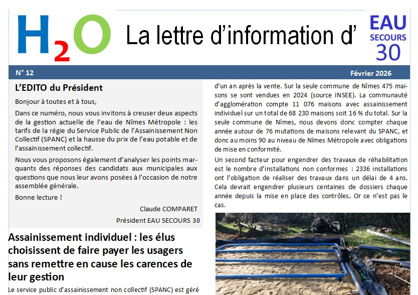 Notre lettre H2O N°12 est en ligne. Découvrez-la sans attendre. Dans ce numéro, nous vous invitons à creuser deux aspects de la gestion actuelle de l’eau de Nîmes Métropole : les tarifs de la régie du Service Public de l’Assainissement Non Collectif (SPANC) et la hausse du prix de l’eau potable et de l’assainissement collectif. Nous vous proposons également d’analyser les points marquants des réponses des candidats aux municipales aux questions que nous leur avons posées à l’occasion de notre assemblée générale. Bonne lecture !